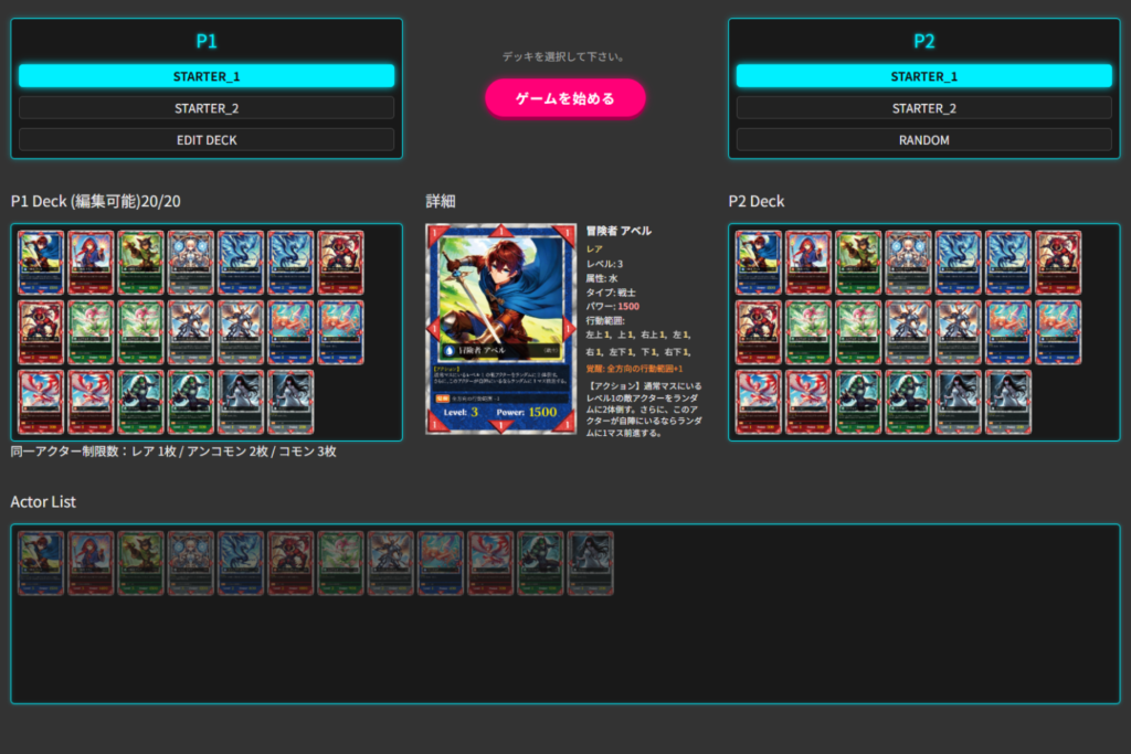 プレイヤー1(自分)のみ、ゲーム開始時に実装されているアクターでデッキの内容を編集可能。